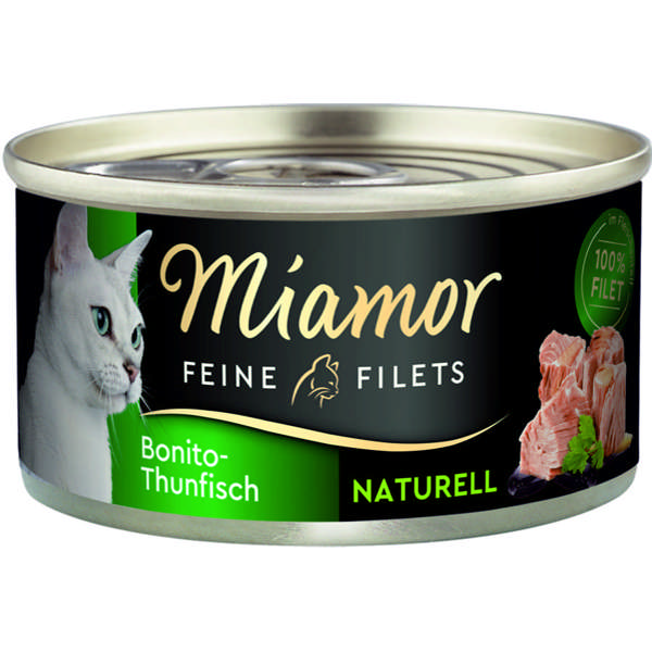Miamor Feine Filets Naturell Bonito-Thunfisch - mit 63% Bonito-Thunfisch und nur im eigenen Saft gegart. Fettarm und hochbekömmlich, ohne tierische Nebenerzeugnisse, ohne Farb- und Konservierungsstoffe, sowie ohne Leber und Innereien. Ergänzungsfuttermittel für ausgewachsene Katzen, auch für ältere und übergewichtige Katzen.