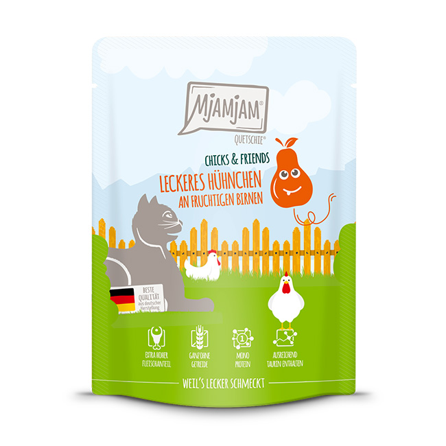 MjAMjAM Cat Chicks & Friends Huhn & Birnen - getreidefrei und glutenfrei. Mit einem hohen Fleischanteil von 70%, bestehend aus Hühnerfleisch, -leber, -herz, -magen. Ohne synthetische Konservierungs- oder Geschmacksstoffe, sowie frei von Zucker und Laktose. Ohne Tiermehle. Alleinfutter für ausgewachsene Katzen.