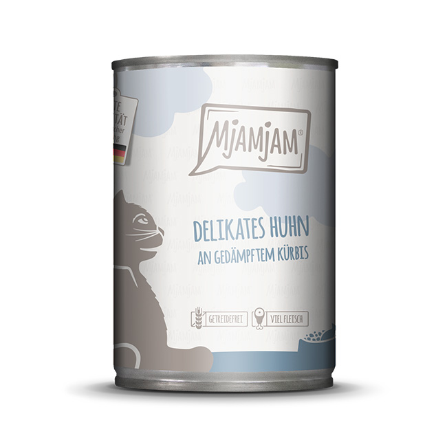 MjAMjAM Cat Huhn & Kürbis - getreidefrei und glutenfrei. Mit einem hohen Fleischanteil von 72%, bestehend aus Hühnerfleisch, -leber, -herz, -muskelmagen. Ohne synthetische Konservierungs- oder Geschmacksstoffe, sowie frei von Zucker und Laktose. Ohne Tiermehle und synthetische Bindemittel. Alleinfutter für ausgewachsene Katzen.