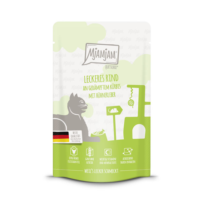 MjAMjAM Cat Quetschie Rind & Kürbis - getreidefrei und glutenfrei. Mit einem hohen Fleischanteil von 55%, bestehend aus Rindfleisch, -lunge, -herzen. Ohne synthetische Konservierungs- oder Geschmacksstoffe, sowie frei von Zucker und Laktose. Ohne Tiermehle. Alleinfutter für ausgewachsene Katzen.