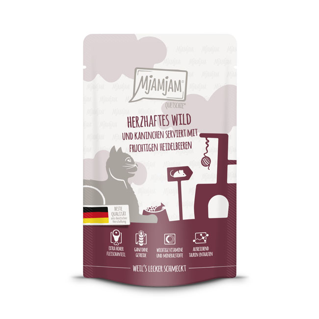 MjAMjAM Cat Quetschie Wild & Kaninchen - getreidefrei und glutenfrei. Mit einem hohen Fleischanteil von 34,5%, bestehend aus Kaninchenfleisch, -herz, -leber, -lunge, -niere. Ohne synthetische Konservierungs- oder Geschmacksstoffe, sowie frei von Zucker und Laktose. Ohne Tiermehle. Alleinfutter für ausgewachsene Katzen.