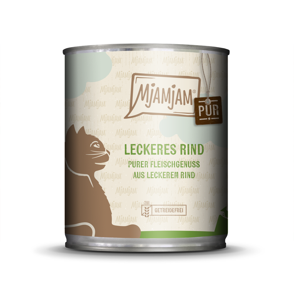 MjAMjAM Cat Rind pur - getreidefrei und glutenfrei. Mit einem hohen Fleischanteil von 71%, bestehend aus Rindfleisch, -leber, -lunge, -herz, -euter, -niere. Ohne synthetische Konservierungs- oder Geschmacksstoffe, sowie frei von Zucker und Laktose. Ohne Tiermehle und synthetische Bindemittel. Alleinfutter für ausgewachsene Katzen.