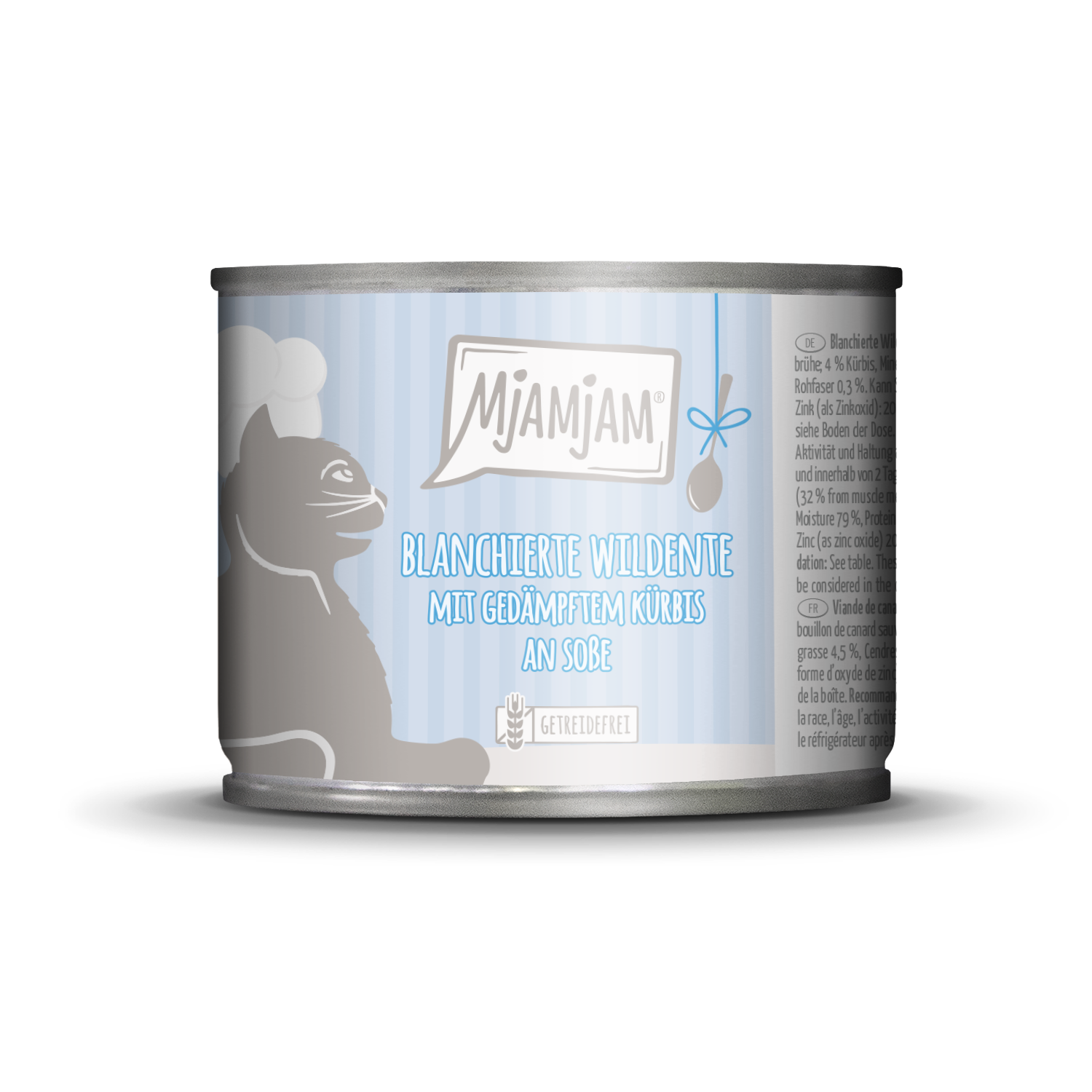MjAMjAM Cat Wildente & Kürbis an Soße - getreidefrei und glutenfrei. Mit einem hohen Fleischanteil von 68%, bestehend aus Wildente (aus Muskelfleisch 32 %, Herzen, fleischigen Hälsen, Lebern). Ohne synthetische Konservierungs- oder Geschmacksstoffe, sowie frei von Zucker und Laktose. Ohne Tiermehle und Bindemittel. Alleinfutter für ausgewachsene Katzen.