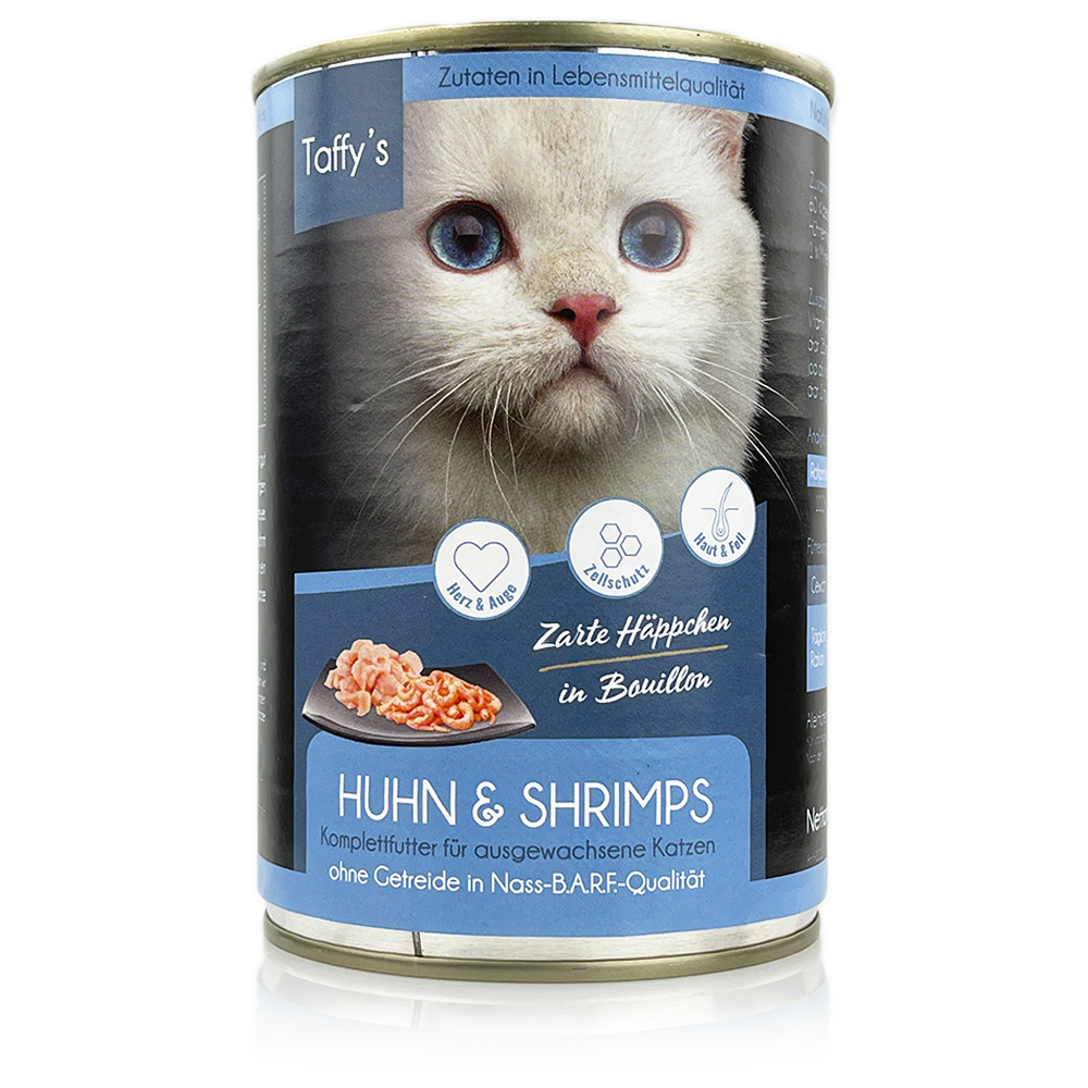 Hühnermägen, Hühnerhälse, 28,8 % Brühe (natürlich enthaltener Fleischsaft), 10 % Shrimps, 1 % Mineralstoffe, 0,1% Grünlippmuschelextrakt, 0,1 % Lachsöl