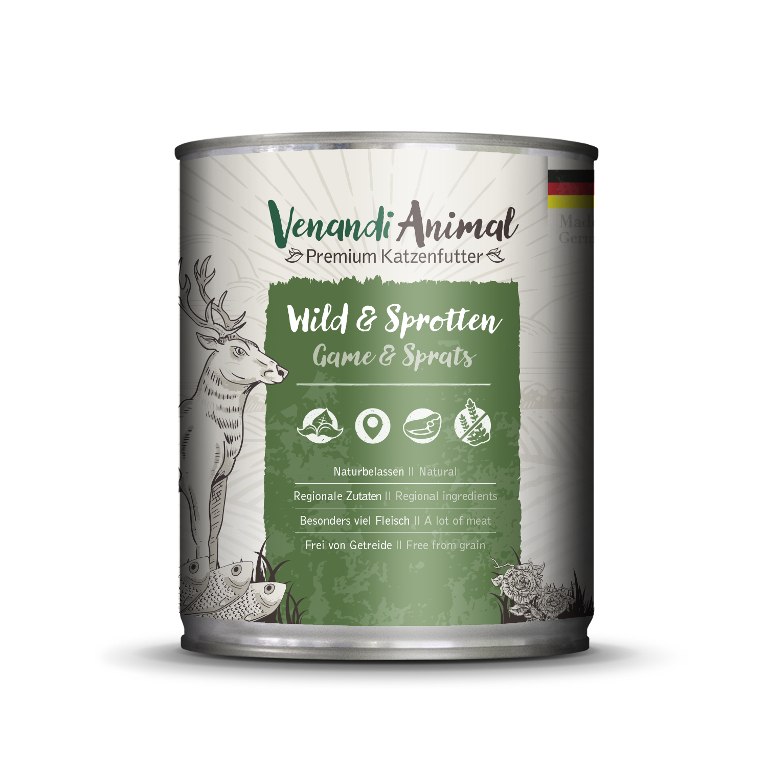 Venandi Cat Wild & Sprotten - Mit 37,5 % Wildfleisch und 32 % Sprotten . Getreidefrei und laktosefrei, sowie ohne Zuckerzusatz. Enthält besonders viel Fleisch aus regionalen Zutaten. Alleinfuttermittel für ausgewachsene Katzen.
