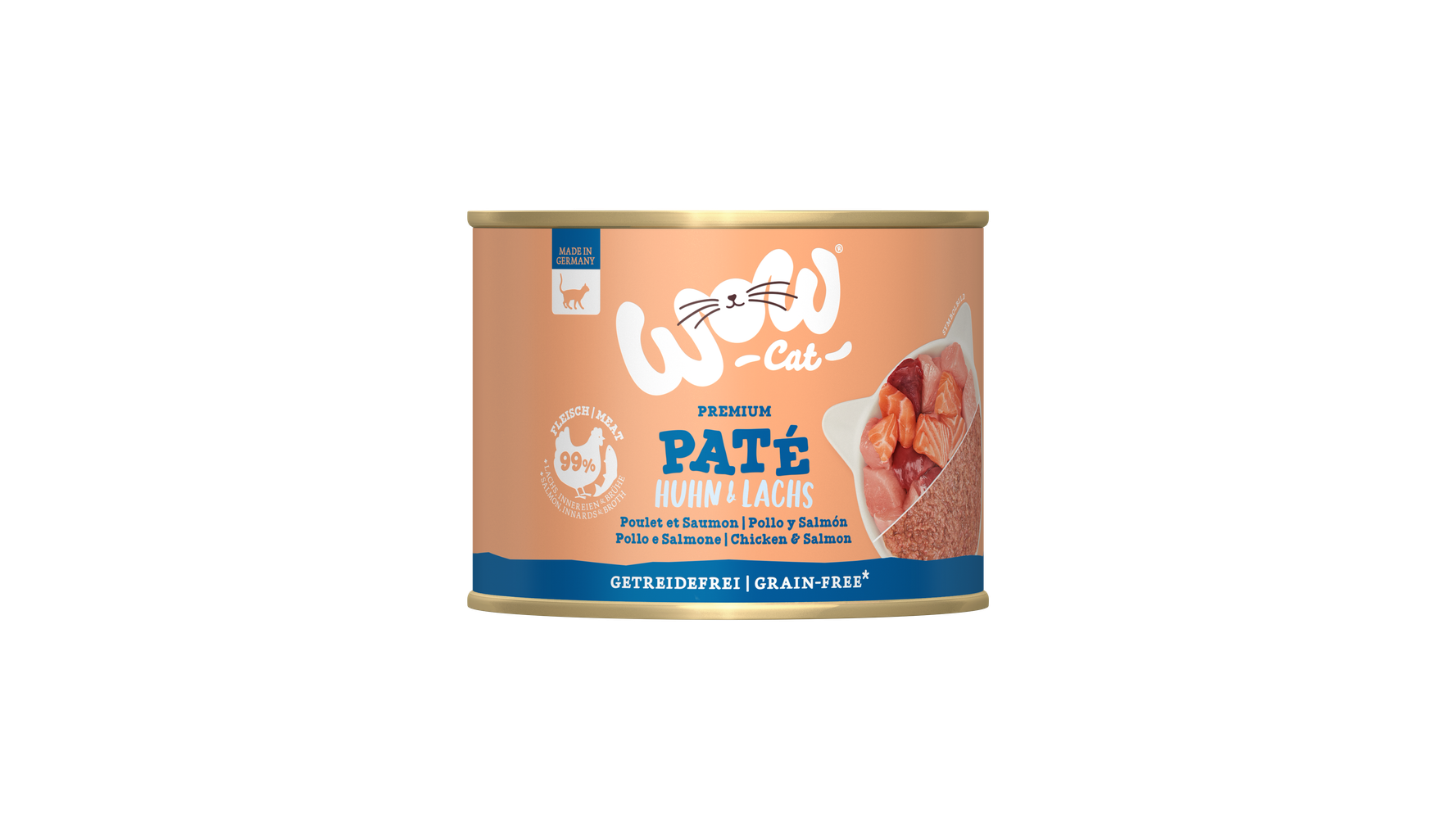 WOW Cat Adult Paté Huhn & Lachs - getreide- und glutenfrei. Enthält 70 % Huhn & Lachs. Mit 99% Fleisch, Fisch, Innereien und Brühe. Ohne künstliche Laktose, Gluten, Farb- und Lockstoffe, Zuckerzusatz und Konservierungsmittel. Wurde ohne Tierversuche hergestellt. Alleinfuttermittel für ausgewachsene Katzen aller Größen und Rassen.