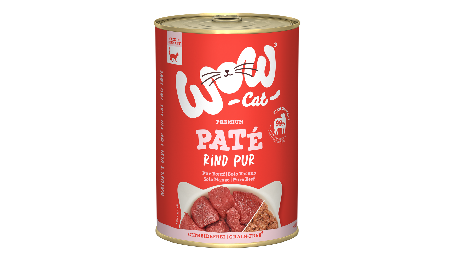 WOW Cat Adult Paté Rind Pur - getreide- und glutenfrei. Enthält 70 % Rind. Single-Protein, mit 99% Fleisch, Innereien und Brühe. Ohne künstliche Laktose, Gluten, Farb- und Lockstoffe, Zuckerzusatz und Konservierungsmittel. Wurde ohne Tierversuche hergestellt. Alleinfuttermittel für ausgewachsene Katzen aller Größen und Rassen.