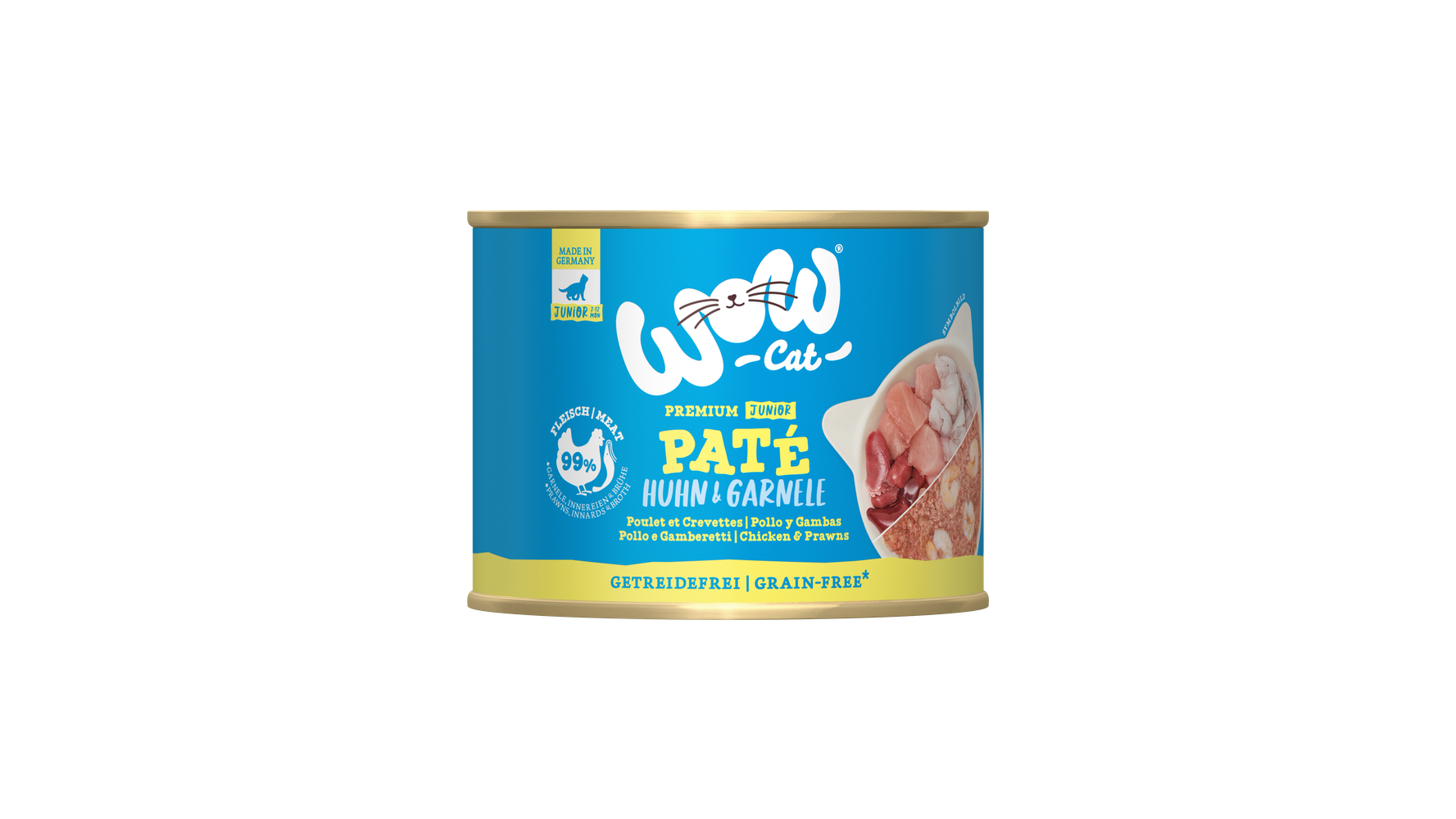 WOW Cat Junior Paté Huhn & Garnele - getreide- und glutenfrei. Enthält 70 % Huhn und Garnelen. Mit 99% Fleisch, Garnelen, Innereien und Brühe. Ohne künstliche Laktose, Gluten, Farb- und Lockstoffe, Zuckerzusatz und Konservierungsmittel. Wurde ohne Tierversuche hergestellt. Alleinfuttermittel für Kitten und junge Katzen im Wachstum zwischen 2 und 12 Monaten.