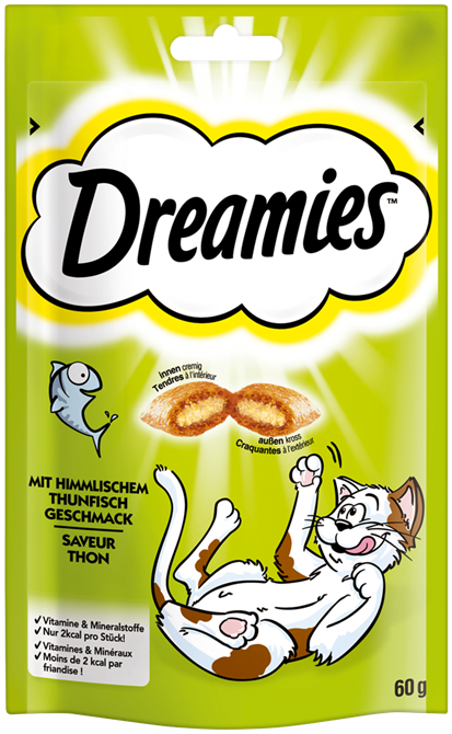 Dreamies Cat mit Thunfisch - Ergänzungsfuttermittel für Katzen und heranwachsende Katzen. Die köstliche Belohnung für zwischendurch. Die cremige Füllung in der knusprigen Hülle ist genau das Richtige für alle Naschkatzen. Die praktische, wiederverschließbare Verpackung hält die Snacks frisch.