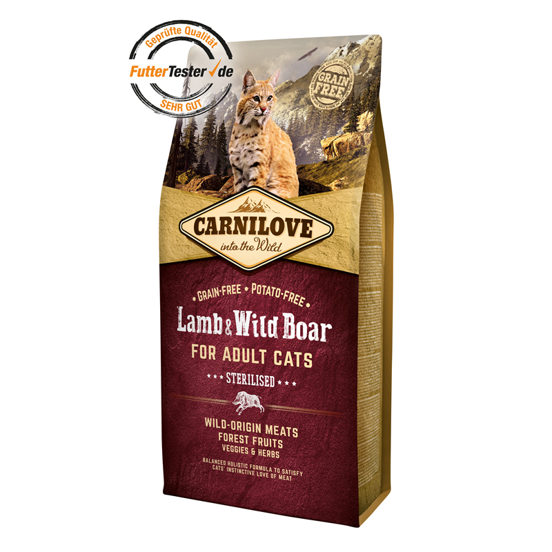 Carnilove Cat Lamm & Wildschwein - getreidefrei und kartoffelfrei. Lamm und Wild sind leicht verdauliche diätetische Proteine, die für die Erhaltung einer perfekten körperlichen Kondition von sterilisierten Katzen ideal sind. Der kontrollierte Gehalt an Mineralstoffen unterstützt die einwandfreie Funktion der Nieren und des Harntrakts, wobei die aus Früchten und Kräutern erhaltenen natürlichen Antioxidanzien reinigende und entzündungshemmende Eigenschaften aufweisen. Alleinfuttermittel für sterilisierte Katzen.