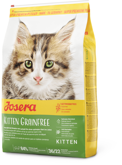 Josera Kitten grainfree - getreidefrei, enthält Geflügelprotein, Lachsöl und Rübenfaser. Mit einem hohen, speziell auf die besonderen Bedürfnisse abgestimmter Energiegehalt, sowie mit diätetischen Fasern, die der Haarballenbildung entgegenwirken können. Hergestellt ohne Gentechnik und ohne Tierversuche in Deutschland. Ohne Soja, Weizen, Zucker und Milchprodukte, sowie ohne künstliche Farb-, Aroma- und Konservierungsstoffe. Alleinfuttermittel für heranwachsende Katzen sowie Katzen-Mütter in der Trage- und Säugezeit.