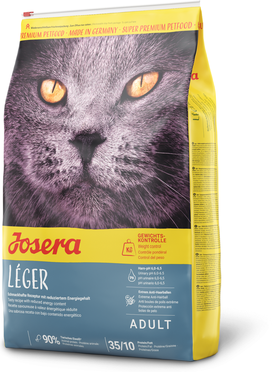 Josera Léger - enthält Geflügelprotein, Früchten und Kräuter. Der hohe Proteingehalt regt den Stoffwechsel an. Mit speziellen diätetischen Fasern, die die Sättigung erhöhen können und der Haarballenbildung entgegenwirken können, sowie mit L-Carnitin, die den Fettstoffwechsel unterstützt. Hergestellt ohne Gentechnik und ohne Tierversuche in Deutschland. Ohne Soja, Weizen, Zucker und Milchprodukte, sowie ohne künstliche Farb-, Aroma- und Konservierungsstoffe. Alleinfuttermittel für kastrierte, wenig aktive oder zu Übergewicht neigenden Katzen.