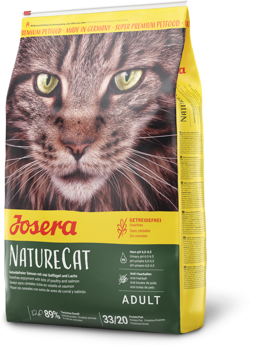 Josera NatureCat - getreidefrei, enthält Geflügelprotein, Rübenfaser und Chicorée-Wurzel. Wertvolle ungesättigte Fettsäuren und hochwertiges Lachsprotein sowie Vitamine und Spurenelemente sorgen für eine gesunde Haut und glänzendes Fell. Ein pH-Wert im Urin von 6,0 - 6,5 wird gefördert und kann der Harnsteinbildung entgegenwirken. Hergestellt ohne Gentechnik und ohne Tierversuche in Deutschland. Ohne Soja, Weizen, Zucker und Milchprodukte, sowie ohne künstliche Farb-, Aroma- und Konservierungsstoffe. Alleinfuttermittel für ausgewachsene Katzen.