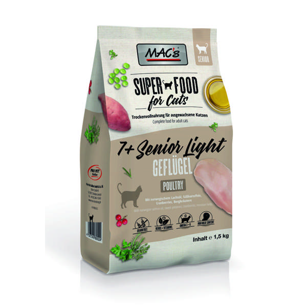 Macs Cat +7 Senior & Light - getreidefrei, mit Hühnchen und Süßkartoffel, verfeinert mit frischen Bergkräutern. Mit norwegischem Lachsöl, sowie mit Cranberries, Bergkräutern und neuseeländischen Grünlipp-Muscheln. Ein moderater Protein- und ein niedriger Fettgehalt sind besonders für Indoorlebende oder Katzen ab dem 7.Lebensjahr geeignet. Allenfutter für ältere Katzen.