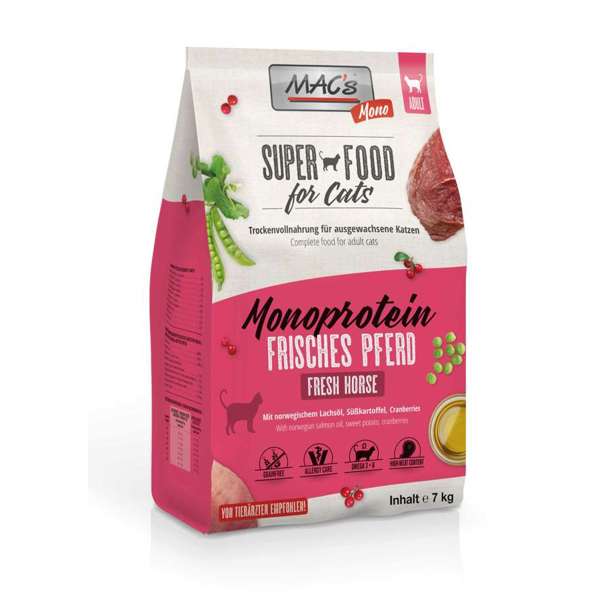 Macs Cat Adult Mono Pferd - getreidefrei, mit Norwegisches Lachsö-l und Cranberries. Besteht aus nur einer Fleischsorte als Rohproteinlieferant und Süßkartoffel als Kohlenhydratquelle. Eignet sich ideal bei empfindlichen Katzen und ist zur Ausschlussdiät. Allenfutter für empfindliche Katzen.