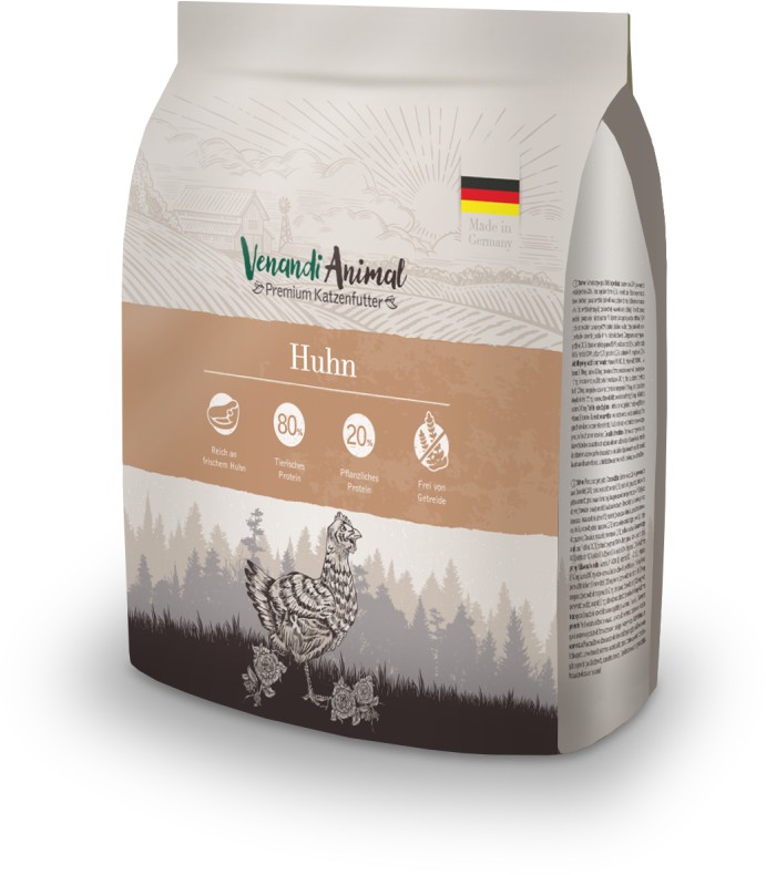 Venandi Cat Huhn - Mit 25 % frischem Hühnerfleisch. Getreidefrei und laktosefrei, sowie ohne Zuckerzusatz. Enthält besonders viel Fleisch, 80 % tierisches Protein und 20 % pflanzliches Protein. Verfeinert mit Lachsöl. Alleinfuttermittel für ausgewachsene Katzen.