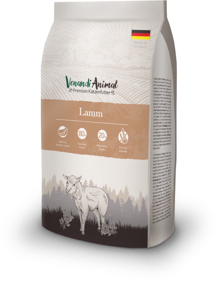 Venandi Cat Lamm - Mit 25 % frischem Lammfleisch. Getreidefrei und laktosefrei, sowie ohne Zuckerzusatz. Enthält besonders viel Fleisch, 80 % tierisches Protein und 20 % pflanzliches Protein. Verfeinert mit Lachsöl. Alleinfuttermittel für ausgewachsene Katzen.