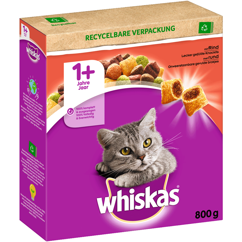 Whiskas Adult 1+ mit Rind - mit 4% Rind, sowie Getreide und Gemüse. Alleinfuttermittel für ausgewachsene Katzen ab 1 Jahr.