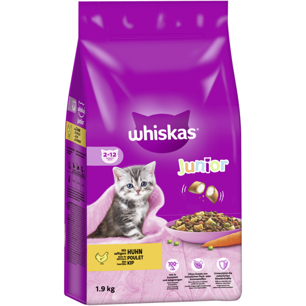 Whiskas Junior mit Huhn - mit 4% Huhn, sowie Getreide und Gemüse. Alleinfuttermittel für heranwachsende Katzen unter 1 Jahr.