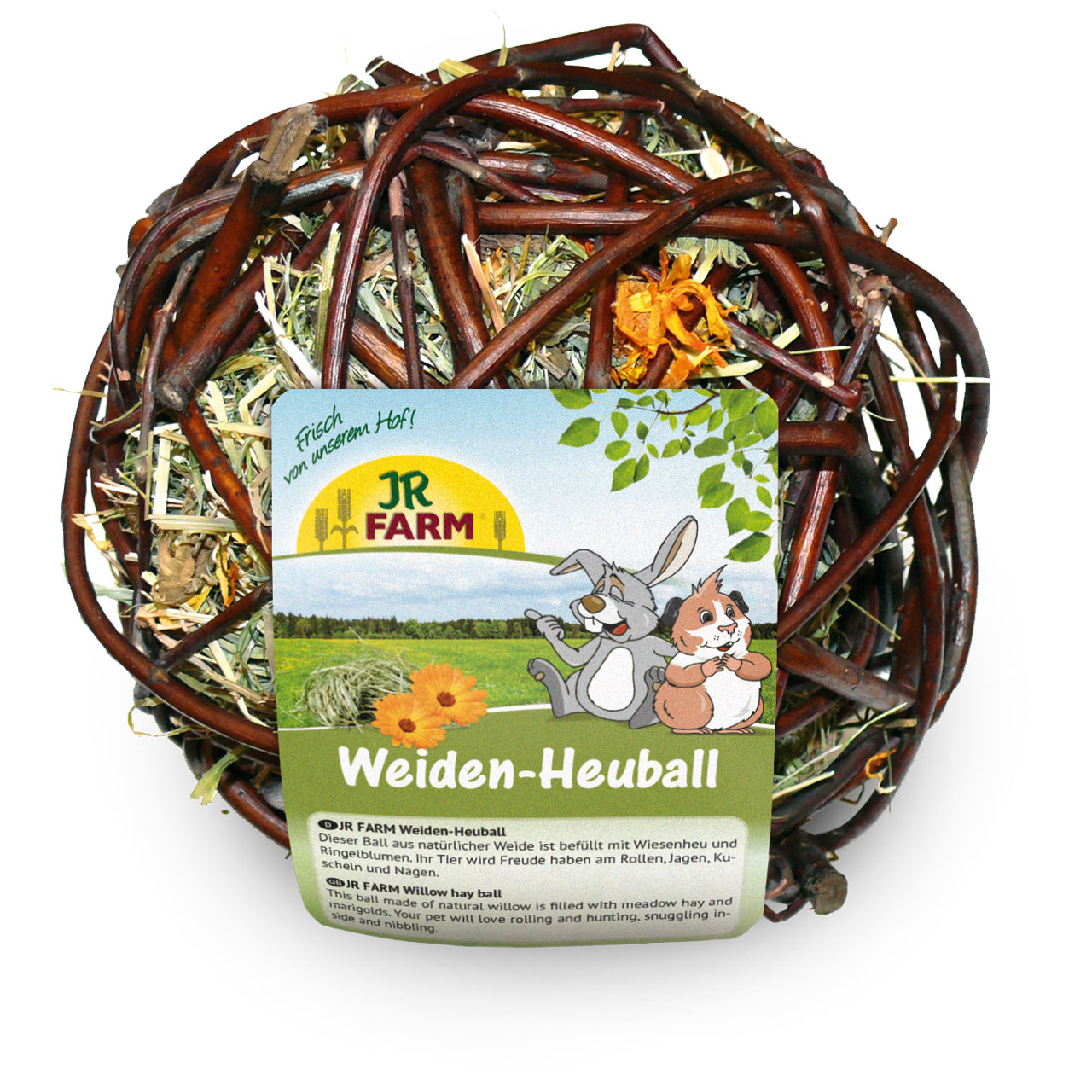JR Farm Weiden Heuball - mit Weide 50%, Bergwiesenheu 40%, Ringelblumenblüten 10%. Dieser Ball aus natürlicher Weide ist befüllt mit Wiesenheu und Ringelblumen. Ihr Tier wird Freude haben am Rollen, Jagen, Kuscheln und Nagen. Ergänzungsfuttermittel und Behausung für alle Nager.