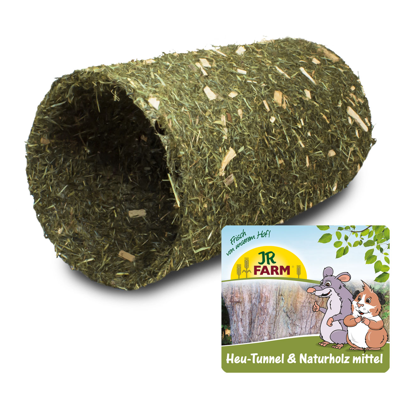 JR Farm Heu Tunnel Naturholz mittel - mit Bergwiesenheu 10,6%, Laubholz 4,3% und Lignocellulose. Der Heu-Tunnel mit Naturholz ist umhüllt mit einer Mischung aus aromatischem Bergwiesenheu und kernigen Holzstücken. Er enthält einen hohen Rohfasergehalt, der beim Knabbern den physiologischen Zahnabrieb der lebenslang wachsenden Nagezähne unterstützt. Durch die Verarbeitung ausschließlich natürlicher Rohstoffe kann der Heu-Tunnel komplett verzehrt werden. Ergänzungsfuttermittel und Behausung für alle mittelgroßen Nager wie Degus oder Ratten.