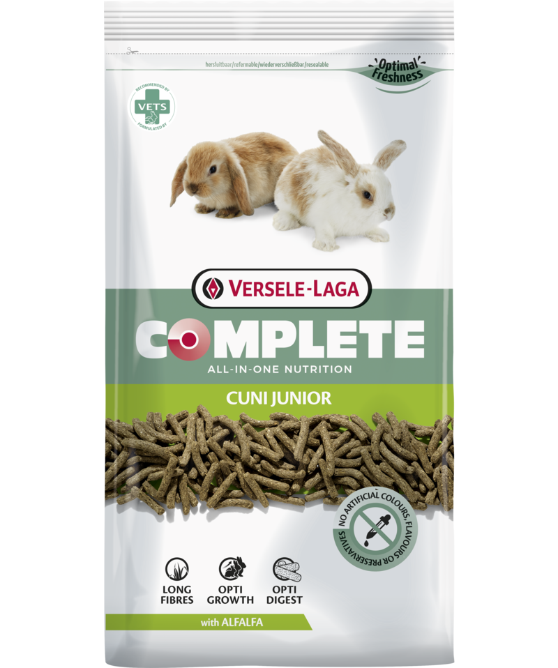 Versele Laga Complete Cuni Junior - mit Luzerne, Saaten und Mineralstoffen. Mit einem hohen Eiweißgehalt für ein optimales Wachstum. Angereichert mit Kräutern für eine optimale Magen- und Darmfunktion. Die langen Fasern und die Struktur der Extrudate gewährleisten einen ausreichenden Zahnabrieb. Ergänzungsfutter für Kaninchen und Zwergkaninchen.
