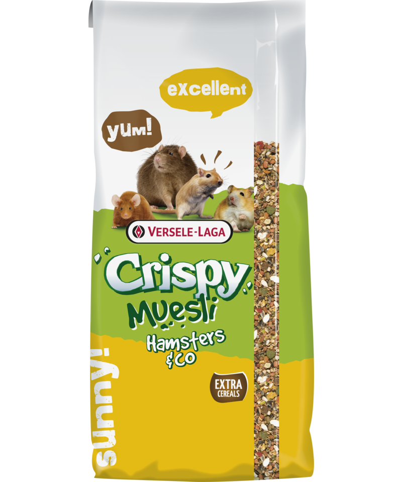 Versele Laga Crispy Muesli Hamsters & Co - mit Gemüse, Nüssen und Getreide. Ist eine energiereiche und eiweißreiche Mischung für Hamster, Rennmäuse, Mäuse und Ratten, angereichert mit den "Happy & Healthy" Pellets für eine Topkondition. Ergänzungsfutter für Hamster, Ratten, Mäuse.