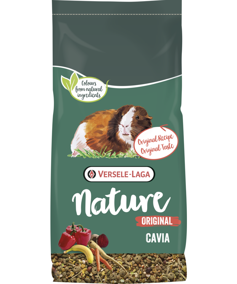 Versele Laga Nature Original Cavia - mit Erbsen, Hagebutte und Algen. Ist angereichert mit allen notwendigen Nährstoffen für eine optimale Kondition, ein faserreiches Futter für eine gute Aufnahme und Verdauung ohne gepresste Pellets. Mit Yucca um unangenehme Gerüche zu reduzieren. Ergänzungsfutter für Meerschweinchen.