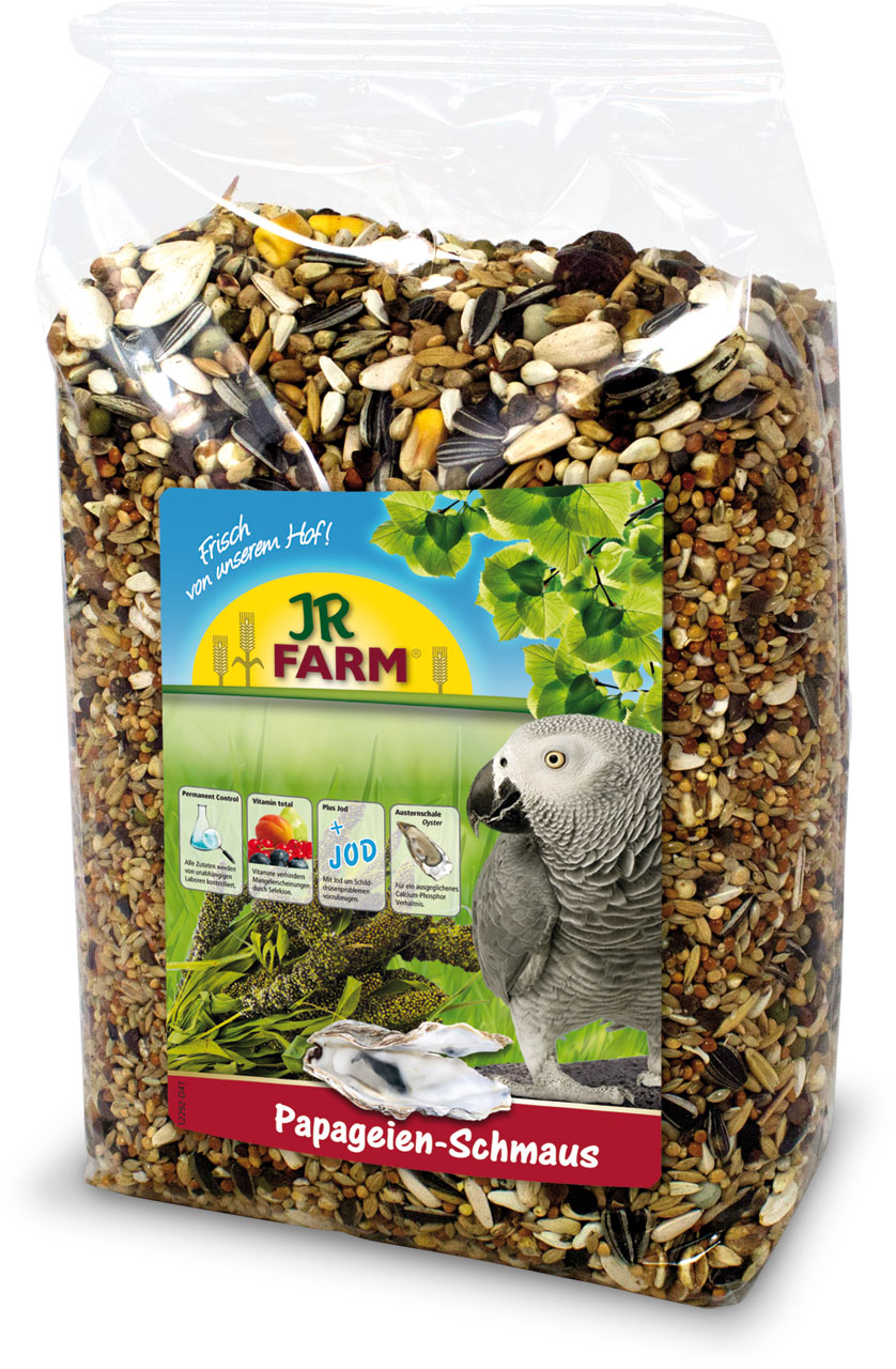 JR Farm Birds Papageien Schmaus - enthält Kardisaat, Paddyreis und Kanariengrassaat. Mit verschiedenen, siliziumhaltigen Hirsearten für ein kräftiges Federkleid. Verfeinert mit entspannender und verdauungsregulierender Hanfsaat, proteinreichen Erbsen zur Kräftigung der Muskulatur und Vitamin-C-haltiger Hagebutte für eine intakte Immunabwehr. Alleinfuttermittel für Graupapageien, Amazonen, Kakadus, Agaporniden und andere Papageien.