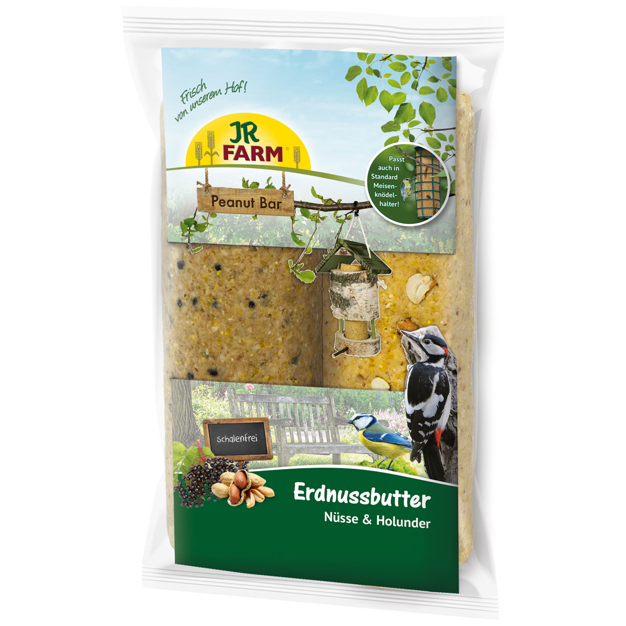 JR Farm Peanut Bar 2er Pack Nüsse & Holunder - enthält Erdnüsse 23,5% und Holunderbeeren 2,5%. Die besonders hochwertige und schalenfreie Rezeptur der Erdnussbutter wurde speziell für die Fütterung von Wildvögeln entwickelt und ist natürlich frei von zugesetztem Salz. Nahrhafte Erdnussbutter als Basis, mit dem Plus an extra vielen knackigen Nüssen oder vitaminreichen Holunderbeeren, sorgt bei unseren Wildvögeln für schnell verfügbare Energie und hinterlässt im Garten oder auf dem Balkon keinerlei Rückstände. Ideal zum Befüllen des Peanut Bars Erdnuss-Turms. Nicht für den menschlichen Verzehr geeignet. Ergänzungsfuttermittel für alle Wildvögel.